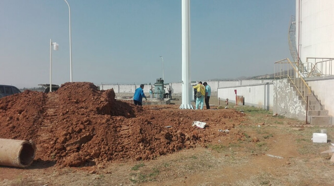 唐山楊官林油庫25米高桿燈,配置光源4盞,400瓦/盞上海亞明金屬鹵化燈,配置一套360度球機(jī)攝像頭。